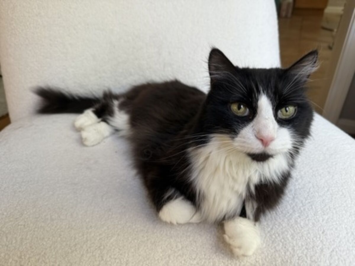 Miso is a gorgeous tuxedo cat with silky-soft fur and striking white designs on her nose, chest, paws, and belly. She runs over to be brushed or to sit down next to her people, greeting them and foll…